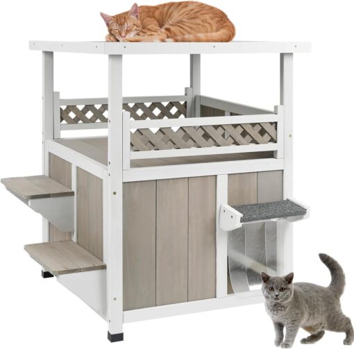 PETSCOSSET 2-Story Outdoor Cat House: Weatherproof Shelter with Escape Doors & Balcony