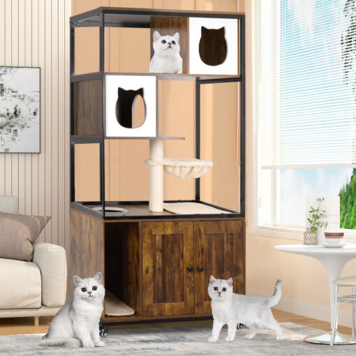 PETSCOSSET 2-in-1 Cat Tree & Litter Box Enclosure: Space-Saving Playground + Odor-Free Care